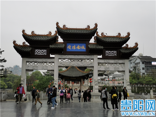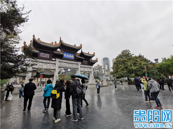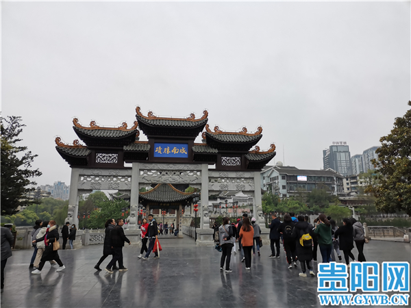 甲秀樓是不少外地遊客來黔旅遊的必打卡之地,地處南明河上,是貴陽曆史的見證,文化發展史上的標誌。“前麵就是甲秀樓,大家自由行動,自覺愛護景區環境。”在城南勝跡,一旅行團在拍照打卡,導遊一邊給團員介紹景點,一邊提醒遊客。