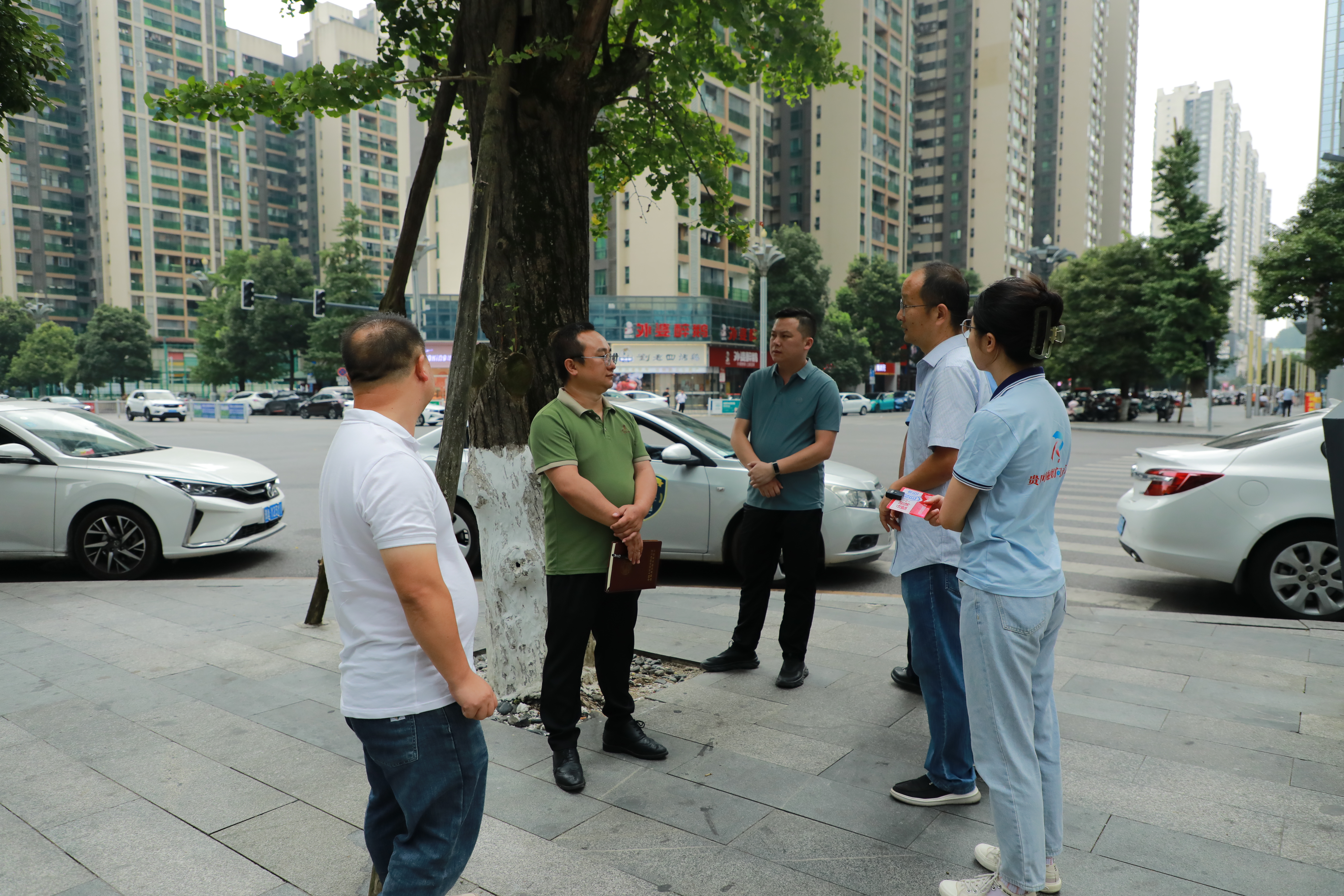 市政協委員周鑫(左二)現場協調督促相關部門解決信號燈接電問題。