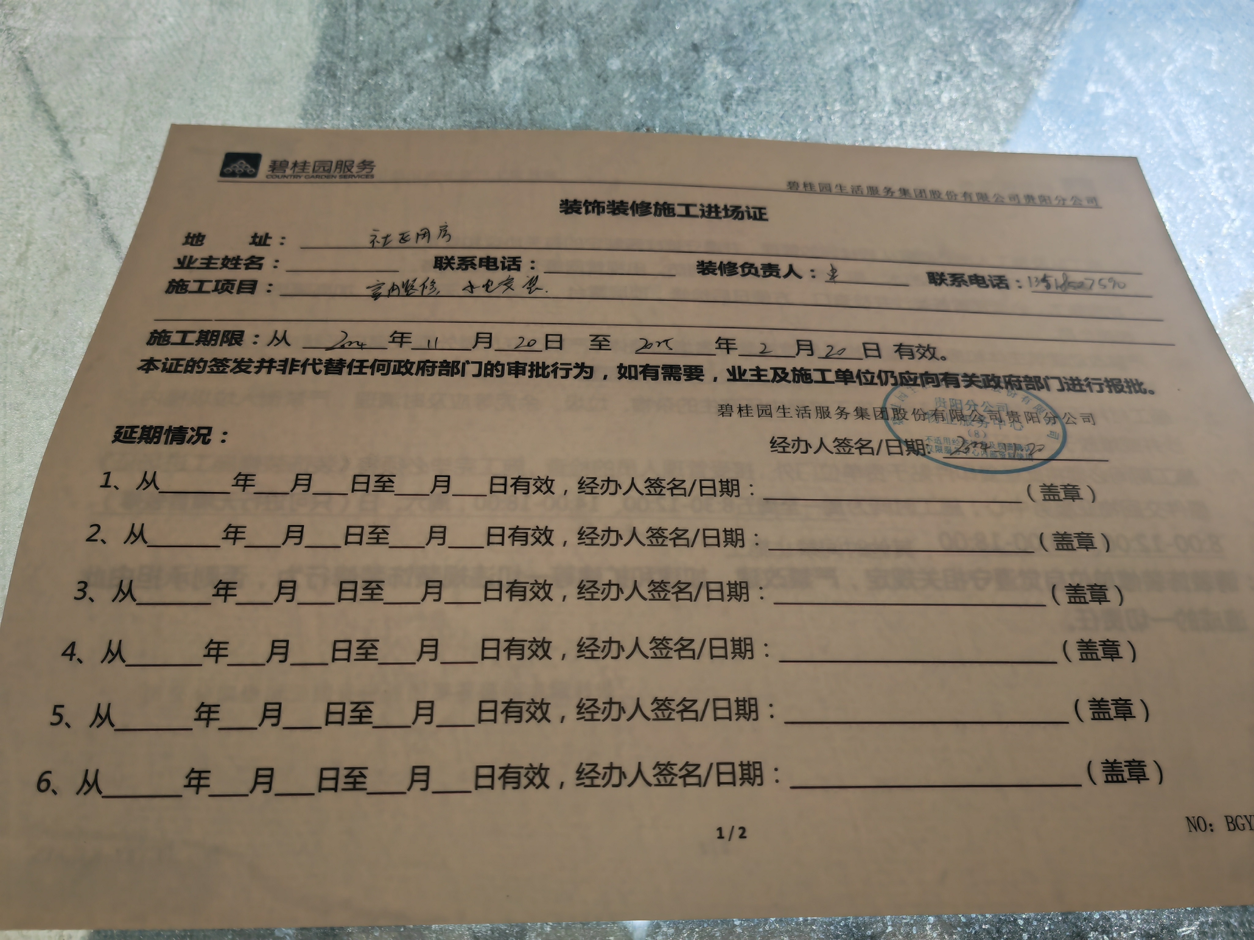 現場張貼的裝飾裝修施工進場證。