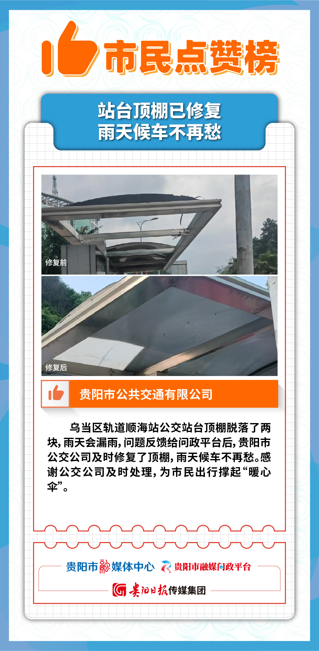公交站漏雨的頂棚修好了。