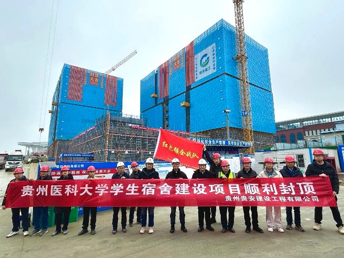 1月26日,由貴安發展集團旗下貴州貴安建設工程有限公司(下稱“貴安建工”)承建的貴州醫科大學學生宿舍項目順利完成主體結構封頂,較原定2月5日的封頂工期提前10天達成建設目標,標誌著該重點民生工程取得階段性重大勝利,為確保2026年9月新生順利入住築牢堅實基礎。
