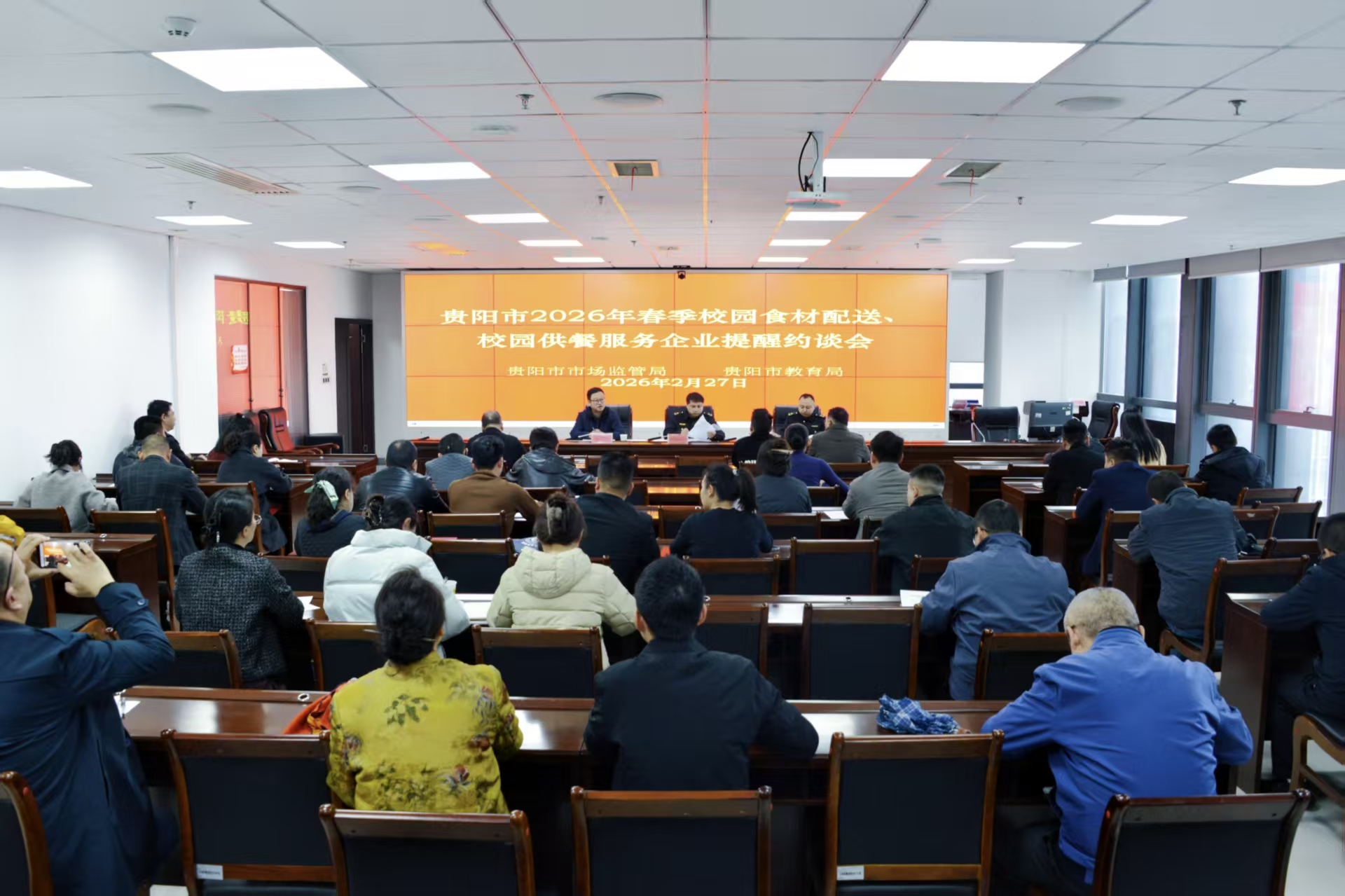 2月27日,市市場監管局召開貴陽貴安2026年春季校園食品安全培訓約談會,進一步壓實主體責任、明確監管要求,全力保障2026年春季開學期間校園食品安全,切實守護中小學生及幼兒“舌尖上的安全”。貴安新區市場監管局,各區(市、縣)市場監管局、開發區分局,以及39家涉校食材配送企業、配餐單位相關負責人參加會議。