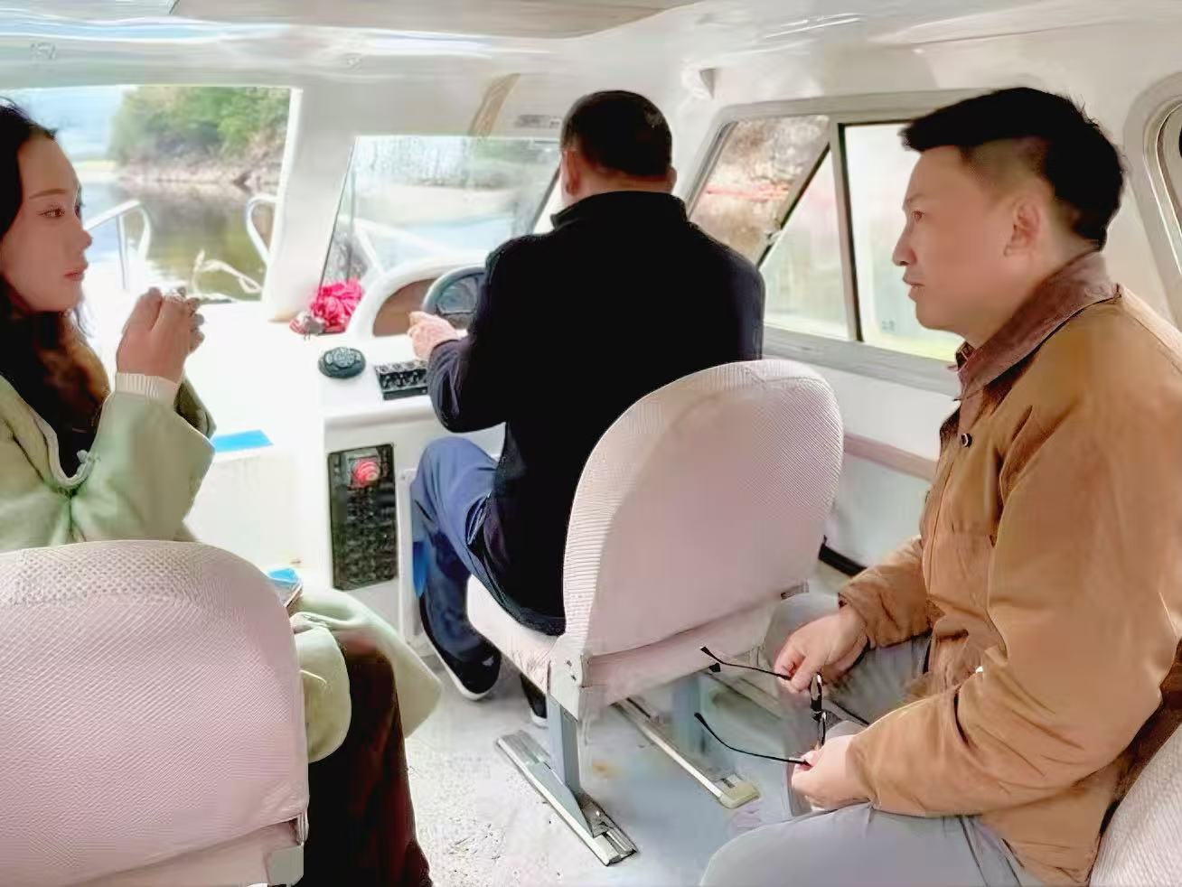 貴陽市水務管理局兩湖一庫管理處處長謝太嶺(右一)在巡查船上介紹百花湖死魚事件處置情況