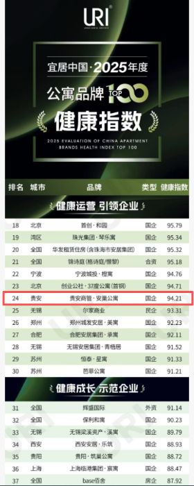 3月11日,記者從貴安發展集團旗下貴州貴安商業資產運營管理有限公司(下稱“貴安商管公司”)獲悉,由該公司運營的安巢公寓在URI城市租住學會發布的《宜居中國·2025年度中國公寓品牌健康指數TOP100》榜單中榮登第24位,獲評“年度公寓品牌健康指數TOP100引領企業”,彰顯了貴安新區在人才安居保障領域的專業實力,也印證了新區以“安居”促“人才興市”的實踐成效。