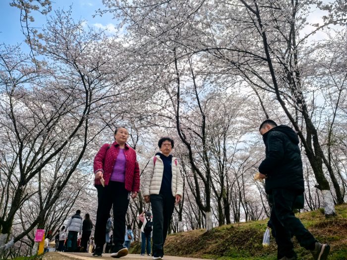 記者在現場看到,上午時分,這座被譽為“藍色星球上最美的櫻花園”園區內已人頭攢動。2.4萬餘畝櫻林綴滿枝頭,粉白花朵隨風輕搖,遊客們或漫步櫻道、駐足定格美景,或結伴賞櫻、暢談歡笑,歡聲笑語與爛漫花香交織,盡顯春日生機與熱鬧。