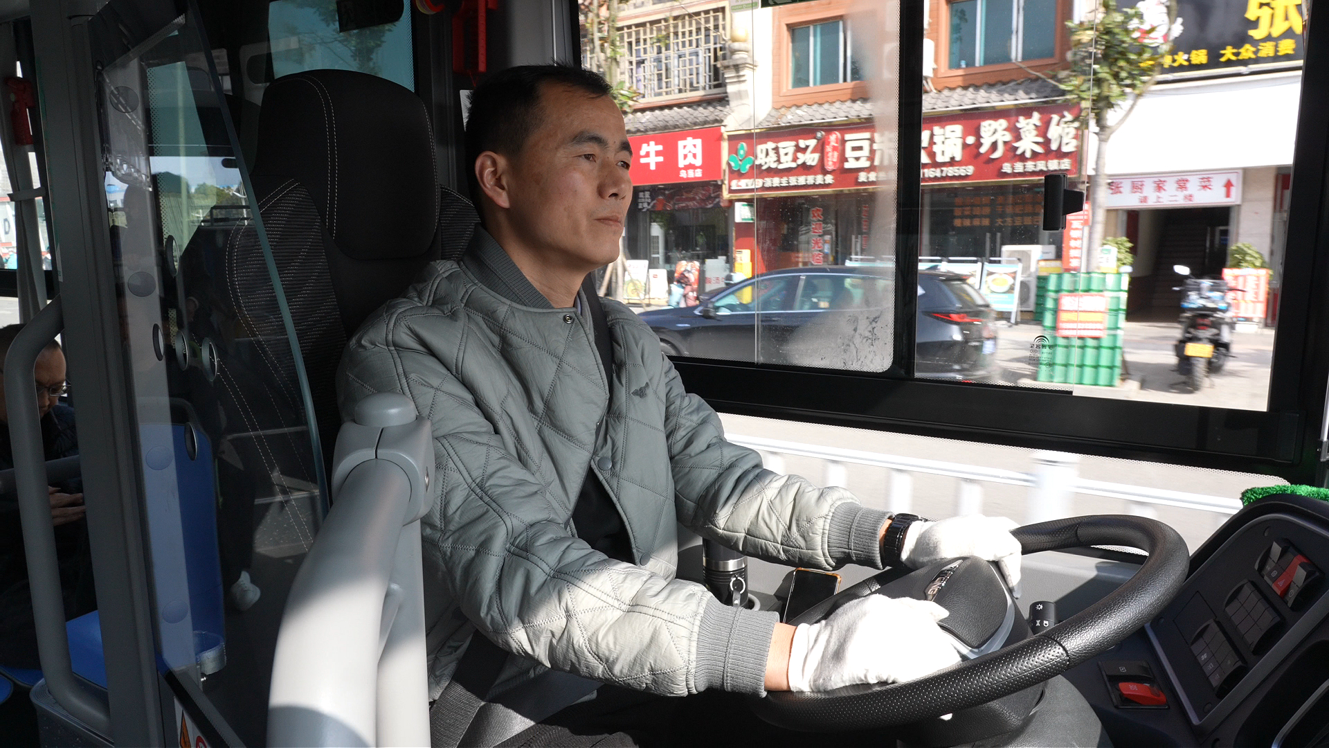 樂灣國際小區接駁專線駕駛員趙雙林正專心駕駛