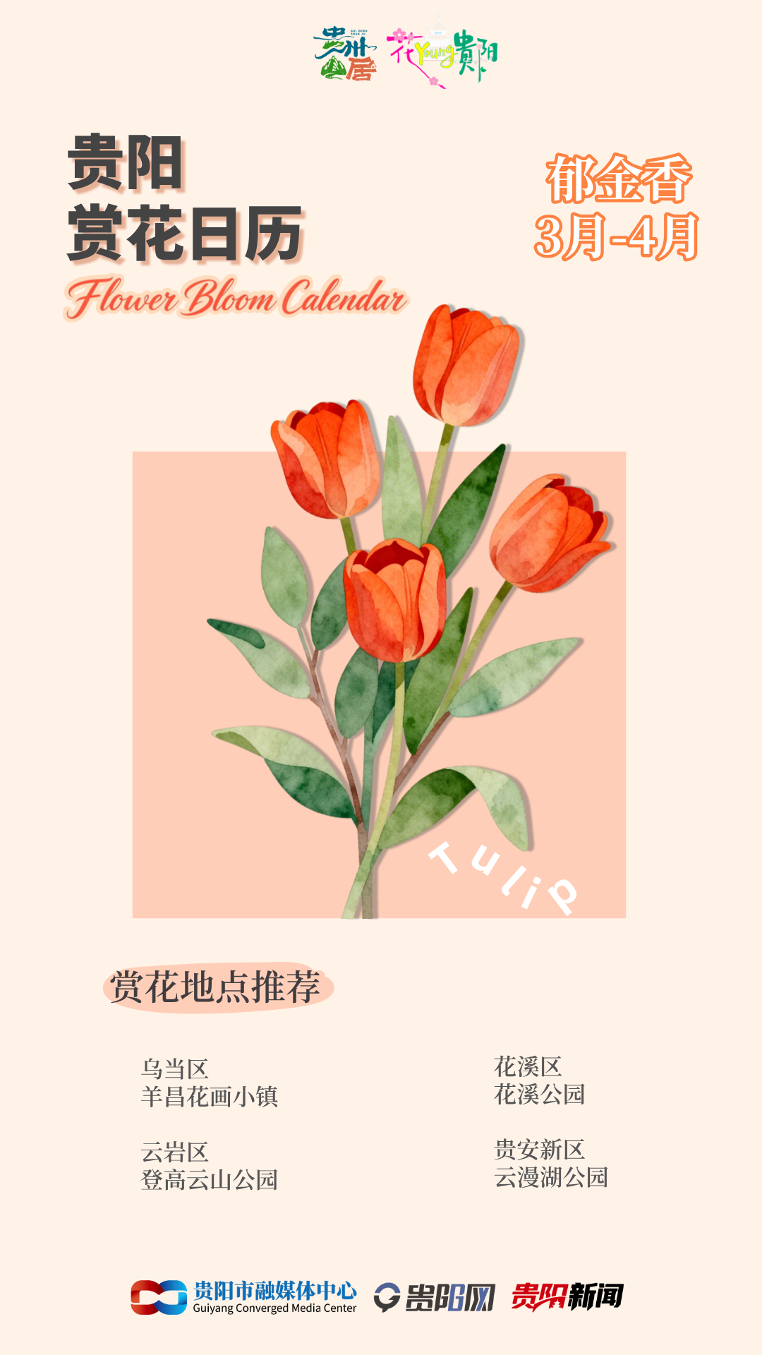 •花溪公園:不同於其他地方的大麵積花海,花溪公園的鬱金香走的是精致小巧路線——雖種植麵積不大,但遠遠望去,依舊能感受到它的溫柔。一朵朵火熱開放的杯型鬱金香,就像好客的主人,盛滿杯中美酒,這樣的美景,你豈能錯過呢?快約上你的搭子,乘坐地鐵三號線,到花溪公園來“鬱”見浪漫!