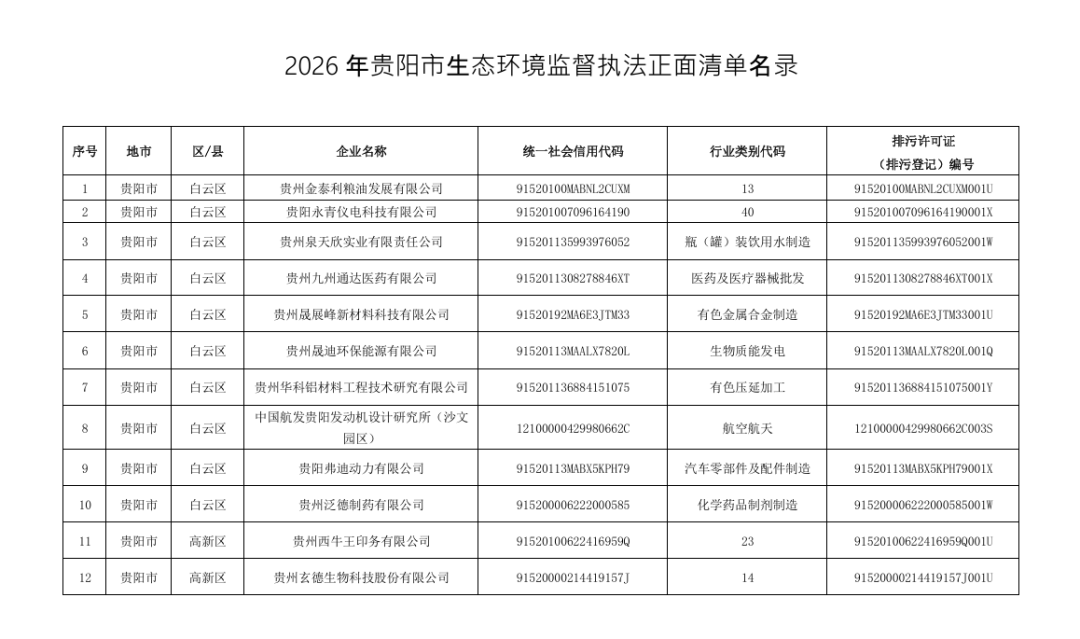 為進一步優化生態環境執法方式,規範生態環境監督執法正麵清單管理,近日,貴陽市生態環境局依據《貴州省生態環境監督執法正麵清單管理辦法》,完成2026年正麵清單優化調整工作,擬將53家企業納入清單管理並予以公示,公示期為2026年3月23日至3月27日。公示期間,如有異議可向貴陽市生態環境局反映,聯係人:李春蕾,聯係電話:。