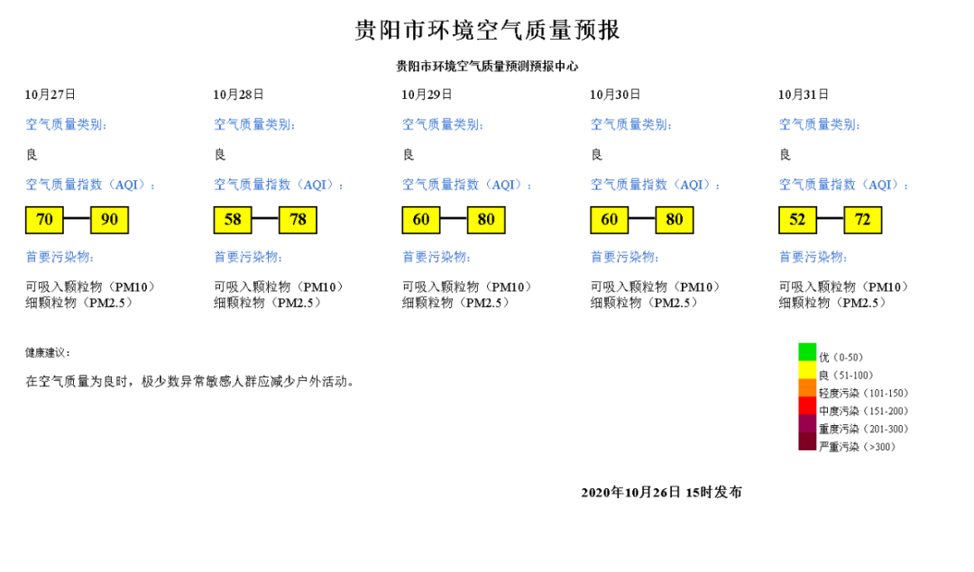預計貴陽市範圍2020年10月27日空氣質量指數(AQI)範圍:70~90;空氣質量類別:良;首要汙染物:可吸入顆粒物(PM10),細顆粒物(PM2.5)。