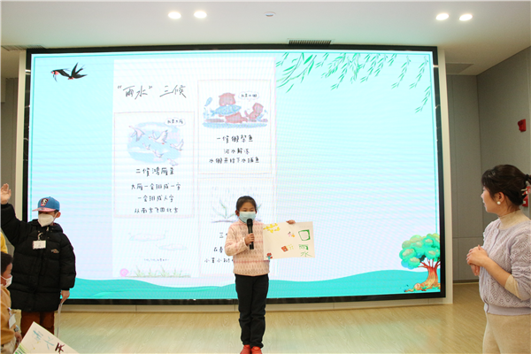 2月18日下午兩點半,活動在四樓多功能廳開展。老師用一首“九九歌”將孩子們帶入今天的春雨課堂,從“雨水節氣的由來”、“雨水三侯”、“民間習俗”、“文學記述”四個方麵,給小朋友們講述節氣“雨水”的文化。隨後,老師給每位小朋友分發了手抄報的材料包,小朋友們根據今天的學習和自己對“雨水”的de理li解jie開kai始shi了le手shou抄chao報bao創chuang作zuo。創chuang作zuo完wan成cheng的de小xiao朋peng友you,還hai會hui上shang台tai講jiang述shu自zi製zhi的de手shou抄chao報bao,分fen享xiang創chuang作zuo感gan受shou。在zai活huo動dong的de最zui後hou,每mei位wei小xiao朋peng友you還hai獲huo得de了le一yi份fen春chun季ji節jie氣qi的de紀ji念nian郵you票piao,通tong過guo集ji郵you的de方fang式shi,進jin一yi步bu了le解jie節jie氣qi文wen化hua。