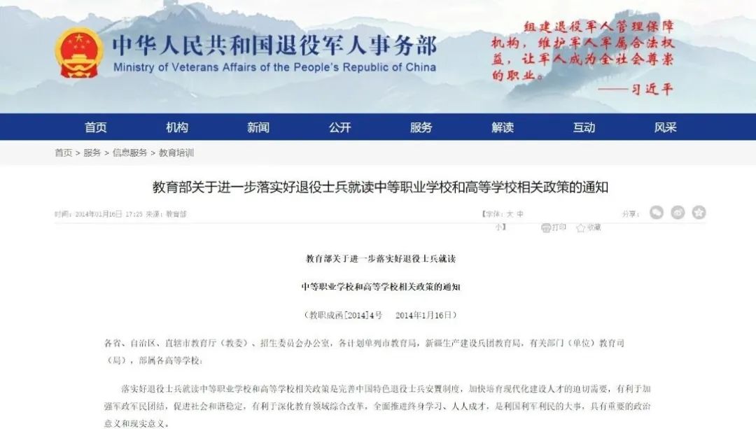 依據:《教育部關於進一步落實好退役士兵就讀中等職業學校和高等學校相關政策的通知》(教職成函[2014]4號)