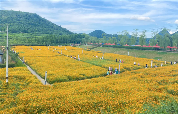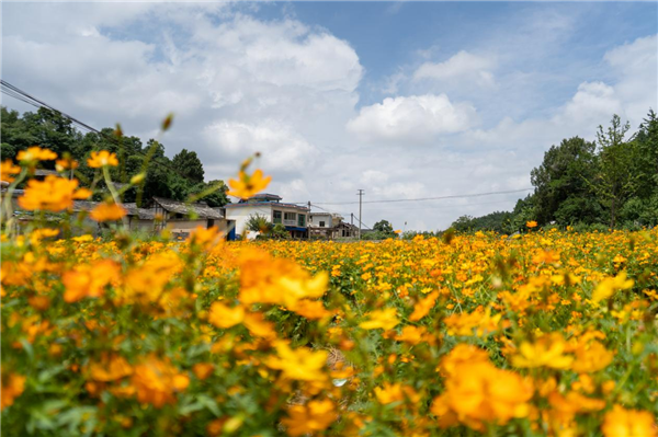 近日,水塘村“桃花塢”裏成片的硫華菊正競相開放,在陽光的照耀下,熠熠生輝。漫步其中,微風從耳邊掠過,滿目色彩交融,仿佛置身“花海飄香”的世外桃源。