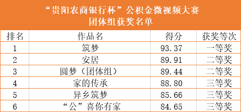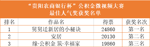 近日,經過網絡投票和專家評審,“貴陽農商銀行杯”公積金微視頻大賽(以下簡稱“大賽”)評審工作圓滿結束,6部團體組獲獎作品、8部個人組獲獎作品以及3部最佳人氣獎作品正式揭曉。