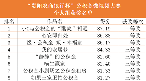 按照大賽規程,參賽作品成績由網絡投票(占比40%)及專家評審(60%)兩部分組成,綜合計算後確定最終獲獎作品名單。經大賽組委會認真計算並複核,團體組《築夢》等6部作品分別獲團體組一、二、三等獎,個人組《小C與公積金的“酸爽”相遇》等8部作品分別獲個人組一、二、三等獎,《舅舅遷新居的小秘訣》等3部作品分別獲最佳人氣獎前三名。