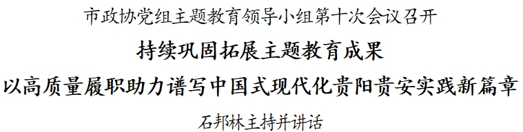 石邦林強調,在主題教育過程中,我們狠抓理論武裝,衷心擁護“兩個確立”、忠誠踐行“兩個維護”更加堅定;強化知行合一,推進全市政協工作高質量發展的舉措更加有力;大興調查研究,助推中國式現代化貴陽貴安實踐的成效更加突顯;突出以學促幹,敢幹實幹快幹會幹幹事創業的精氣神更加昂揚;抓好檢視整改,勇於自我革命加強自身建設的能力更加過硬。我們更加深刻認識到,必須把政治建設擺在首位,把“關鍵少數”作為重點,把為民服務作為根本,把問題導向作為關鍵,把推動高質量發展作為主題,切實把主題教育煥發出的熱情幹勁轉化為助力“強省會”和中國式現代化貴陽貴安實踐的履職成效。