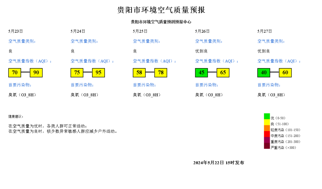 預計貴陽市範圍2024年5月23日空氣質量指數(AQI)範圍:70~90;空氣質量類別:良;首要汙染物:臭氧(O3_8H)。