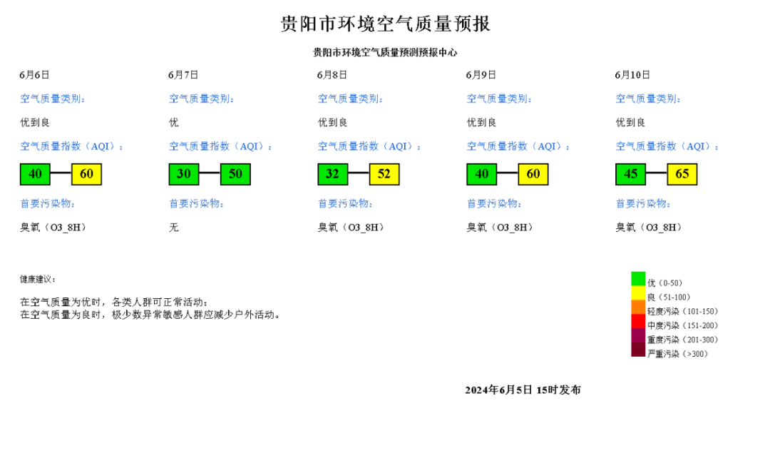 預計貴陽市範圍2024年6月6日空氣質量指數(AQI)範圍:40~60;空氣質量類別:優到良;首要汙染物:臭氧(O3_8H)。