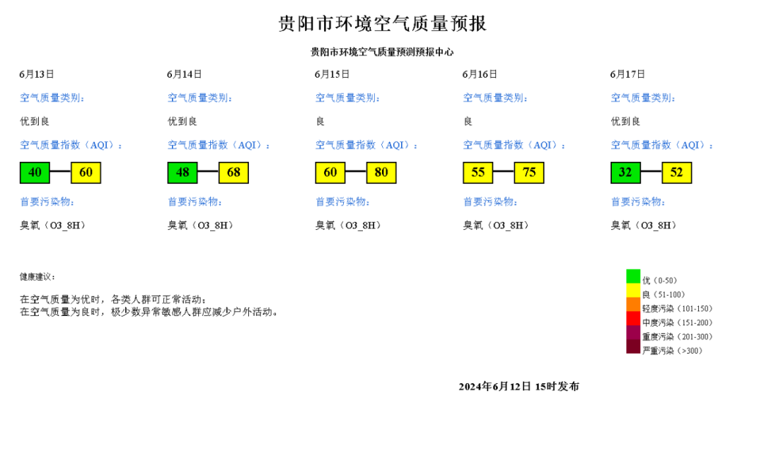 預計貴陽市範圍2024年6月13日空氣質量指數(AQI)範圍:40~60;空氣質量類別:優到良;首要汙染物:臭氧(O3_8H)。