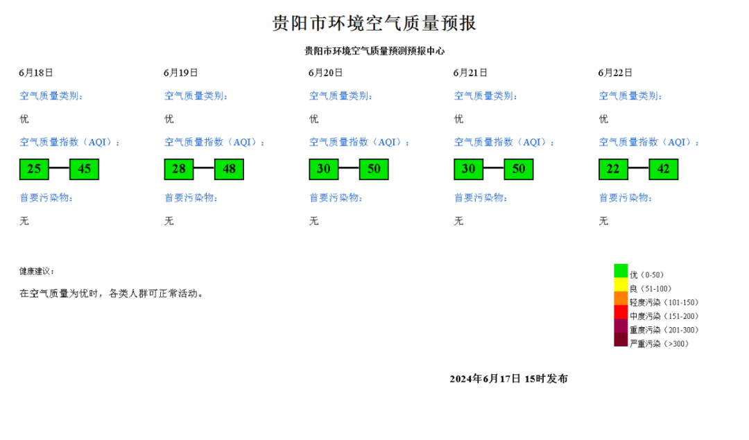 預計貴陽市範圍2024年6月18日空氣質量指數(AQI)範圍:25~45;空氣質量類別:優。