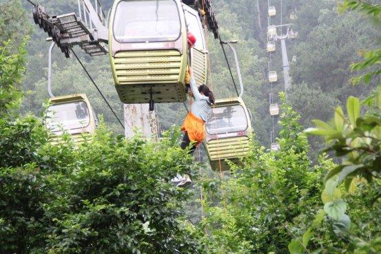 在黔靈山公園,演練模擬索道設備突發故障停運,索道轎廂內有2名ming遊you客ke被bei困kun,索suo道dao運yun營ying管guan理li方fang立li即ji啟qi動dong救jiu援yuan預yu案an,救jiu援yuan人ren員yuan第di一yi時shi間jian趕gan赴fu遊you客ke被bei困kun點dian下xia方fang,安an撫fu遊you客ke情qing緒xu。另ling一yi組zu救jiu援yuan人ren員yuan爬pa上shang鐵tie塔ta支zhi架jia,運yun用yong救jiu援yuan工gong具ju到dao達da“被困遊客”的吊廂,再通過緩降器和地麵救援人員的配合,最終將被困遊客安全救助到地麵,救援過程平穩有序,成功解救被困遊客。