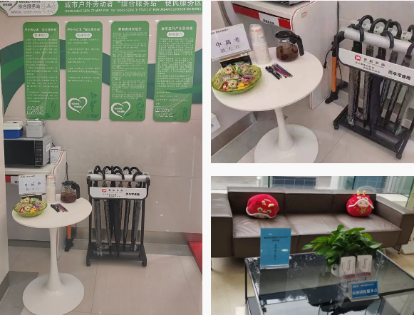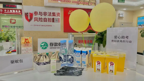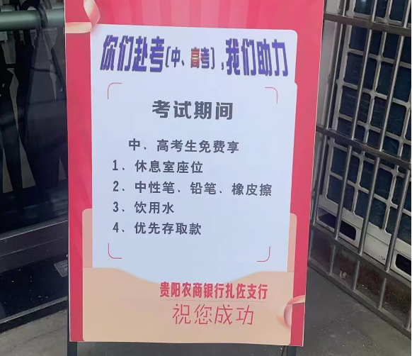 雲岩支行分會轄內營業部、未來方舟支行、夢想典城支行、中山南路支行、寶山北路支行、飛山街支行、八鴿岩支行將戶外勞動者服務站設立為“中高考助力點”。網點門口放置有助考訊息的熒光板,設置愛心櫃台、愛心專區等,為考生與家長免費提供複印打印、乘涼休憩、飲水、雨衣雨具等服務,為考生們加油鼓勁。