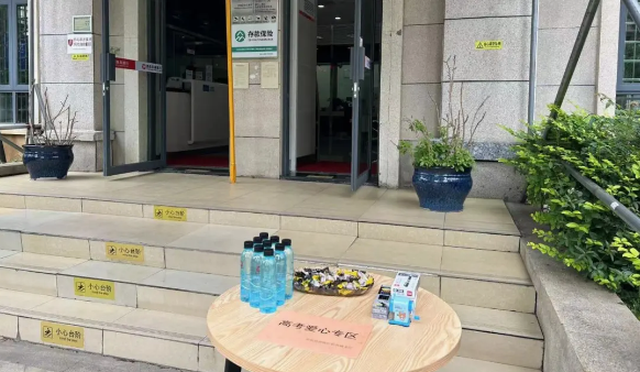 小河支行分會在網點門口設置助考驛站,貼心準備了文具套、中性筆、2B鉛筆、雨傘、瓶裝水等,為考生和家長們送上暖心服務,並在網點勞動驛站設置家屬休息等候區及綠色窗口,助力學子圓夢。