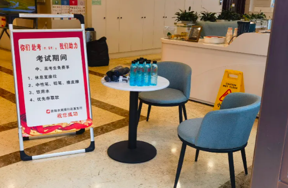 修文支行分會在網點設立“考試加油站”,為考生及家長提供礦泉水、文具、應急藥品等。考試期間為考生免費提供休息室,免費領取中性筆、鉛筆、橡皮擦,飲用水等,並為考生及家長優先辦理存取款業務。